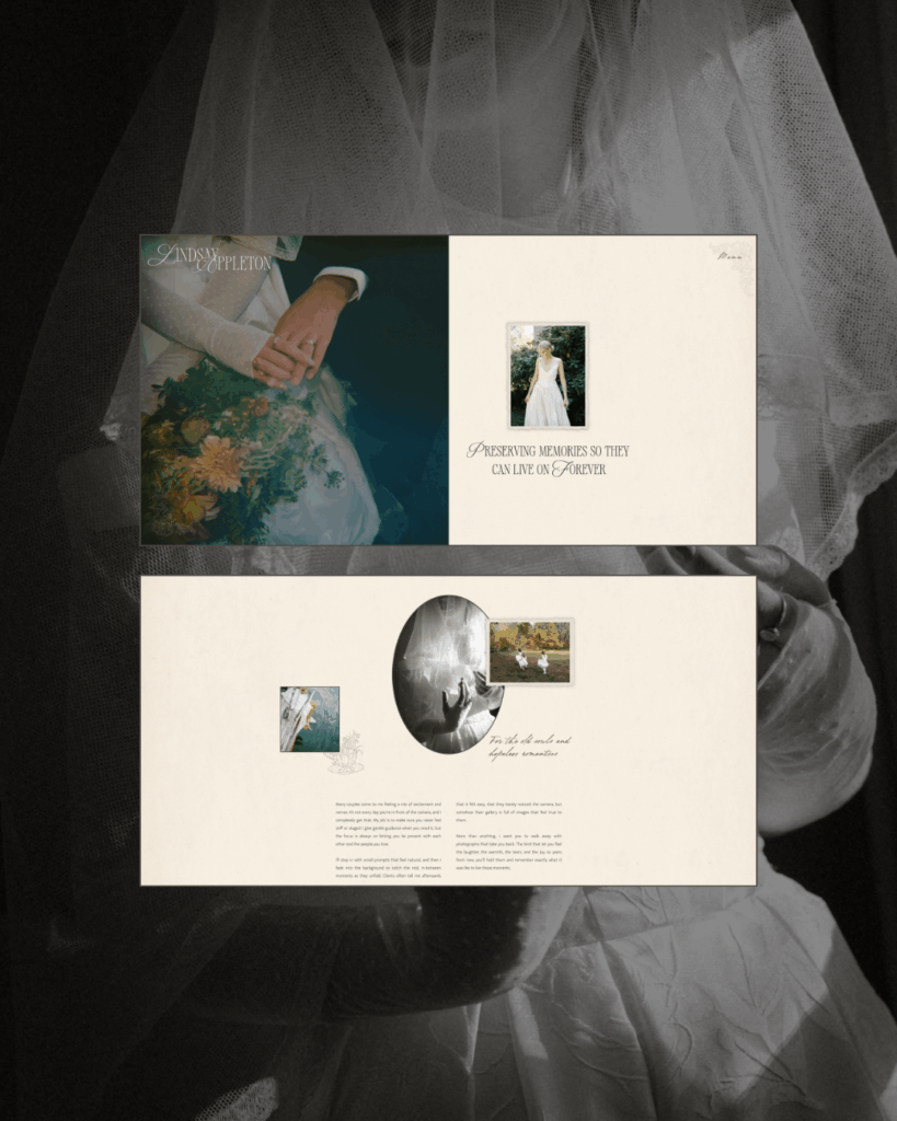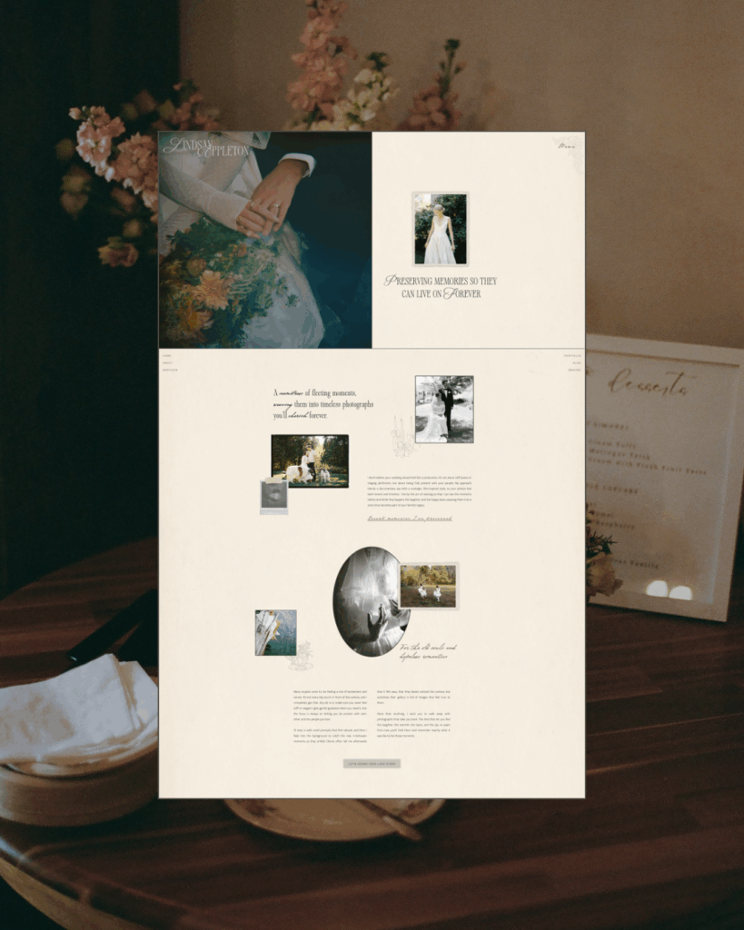 The final website is a Showit website for photographers that feels both editorial and personal. Vintage-inspired touches, thoughtful typography, and generous white space create a calm, sophisticated environment where prospective clients immediately feel Lindsay’s artistry and attention to detail.